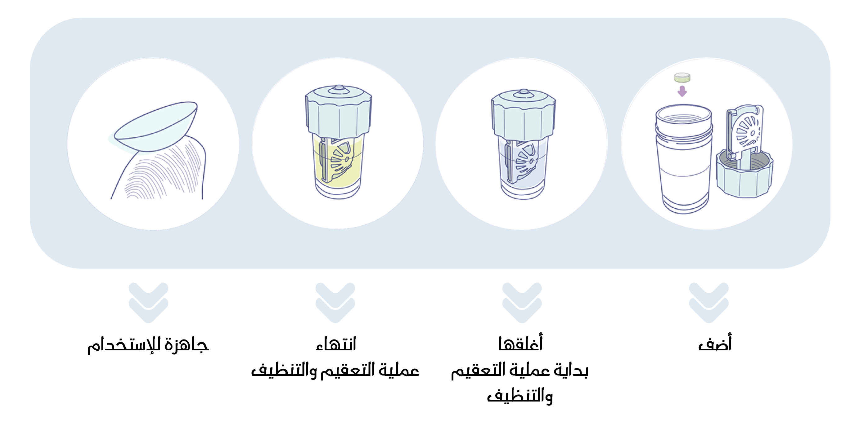 5. انتظار التعقيم: اترك العدسات في الحافظة لمدة لا تقل عن ساعتبن ولا تزيد عن 12 ساعات، حيث يقوم المحلول بعملية التعقيم والتنظيف.